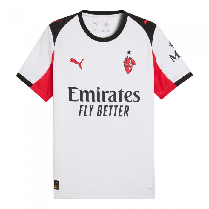 The AC Milan 25/26 Away Kit takes a fresh approach to the club’s classic away look. Featuring a crisp white base contrasted with striking red and black details on the shoulders and sleeves, this kit blends tradition with innovation. The redesigned Milan crest adds a modern edge while keeping the Rossoneri spirit alive.