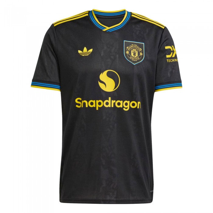 Step out like the pros with the Manchester United 25/26 Third Kit – Player Edition. This bold design features a sleek black base with striking yellow and blue accents, paired with a retro Adidas trefoil logo and a unique monochrome Manchester United crest. With the Snapdragon sponsor across the chest, it blends heritage with modern football style.