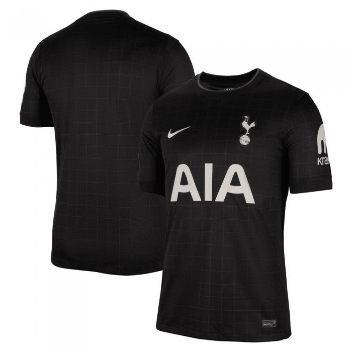 Stand out with understated class in the Tottenham Hotspur 25/26 Away Kit – Fan Edition. This design introduces a clean black base with subtle tonal checkered detailing, perfectly balanced by the bold white crest, Nike logo, and AIA sponsor.